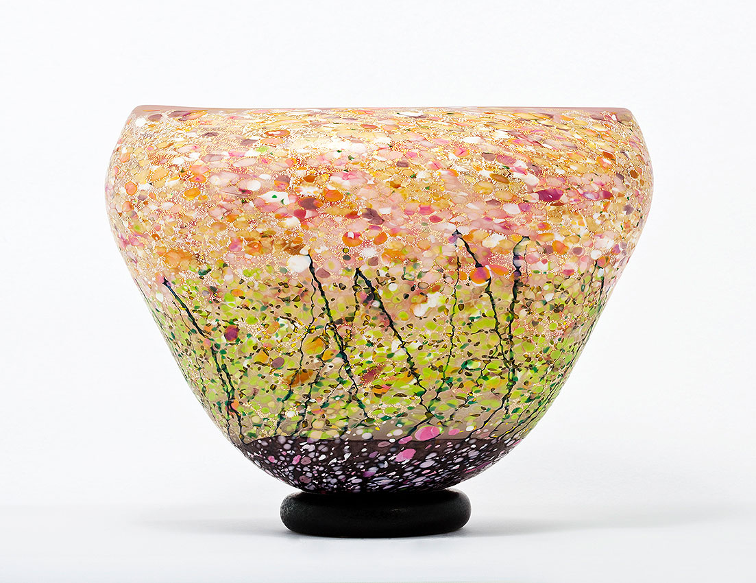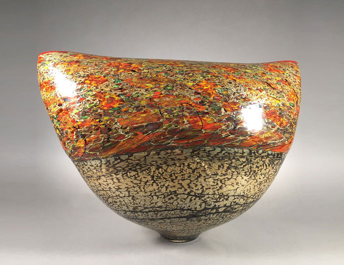 別人用VR技術復刻《美術》,安井顕太卻把四季元素的紋樣燒進玻璃裝置。傳統雲母區塊融化後,遇到金銀箔碎片,在光影中模擬櫻花飄落土地、波光粼粼的海面、金光閃爍中的楓紅、冬雪飄落交織的紅白梅。『玻璃藝術不該只活在工藝的思維裡』,安井顕太舉起新作宣示不辜負歷史、不辜負技藝;為玻璃工藝掀起傳世的藝術巨浪。