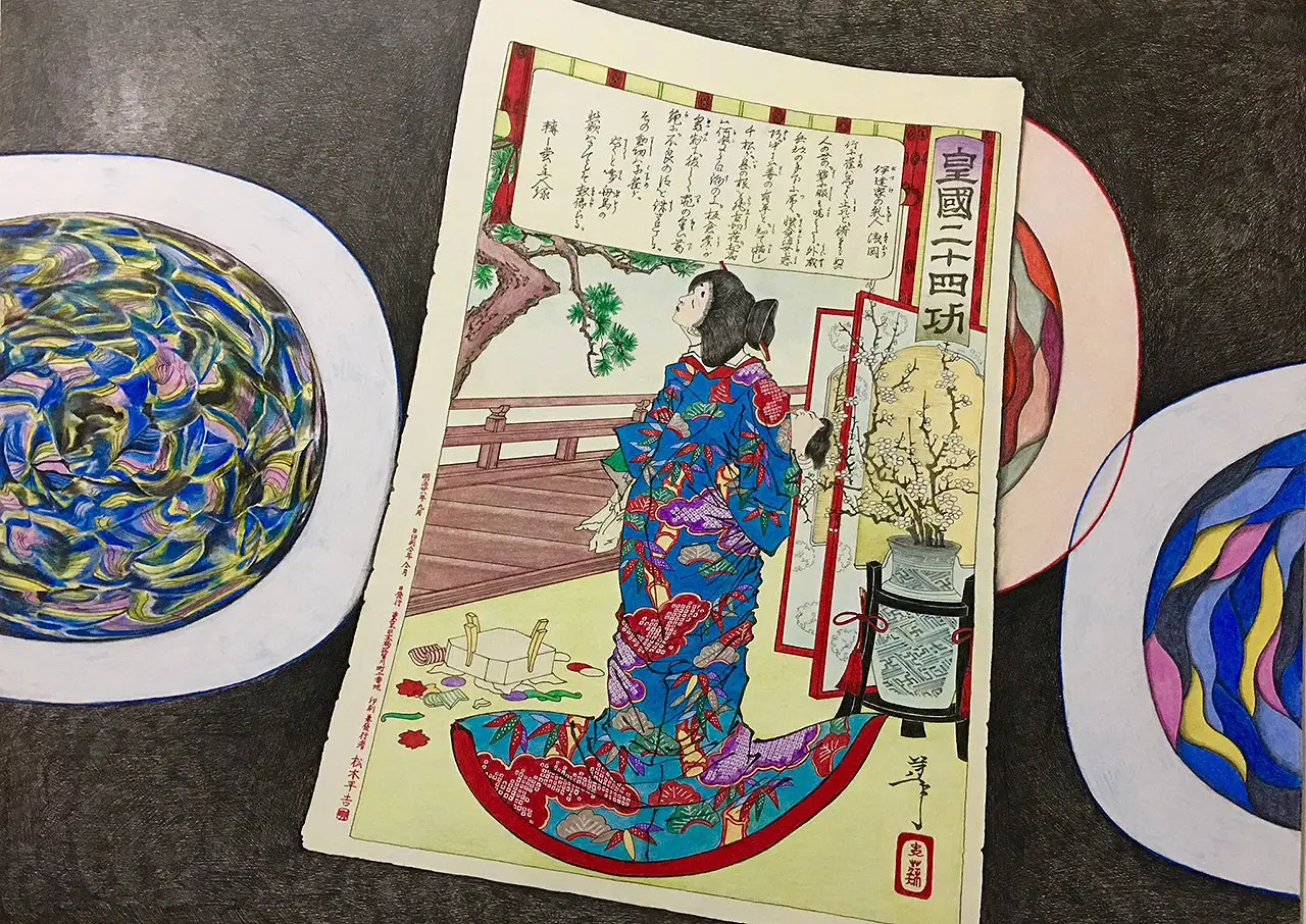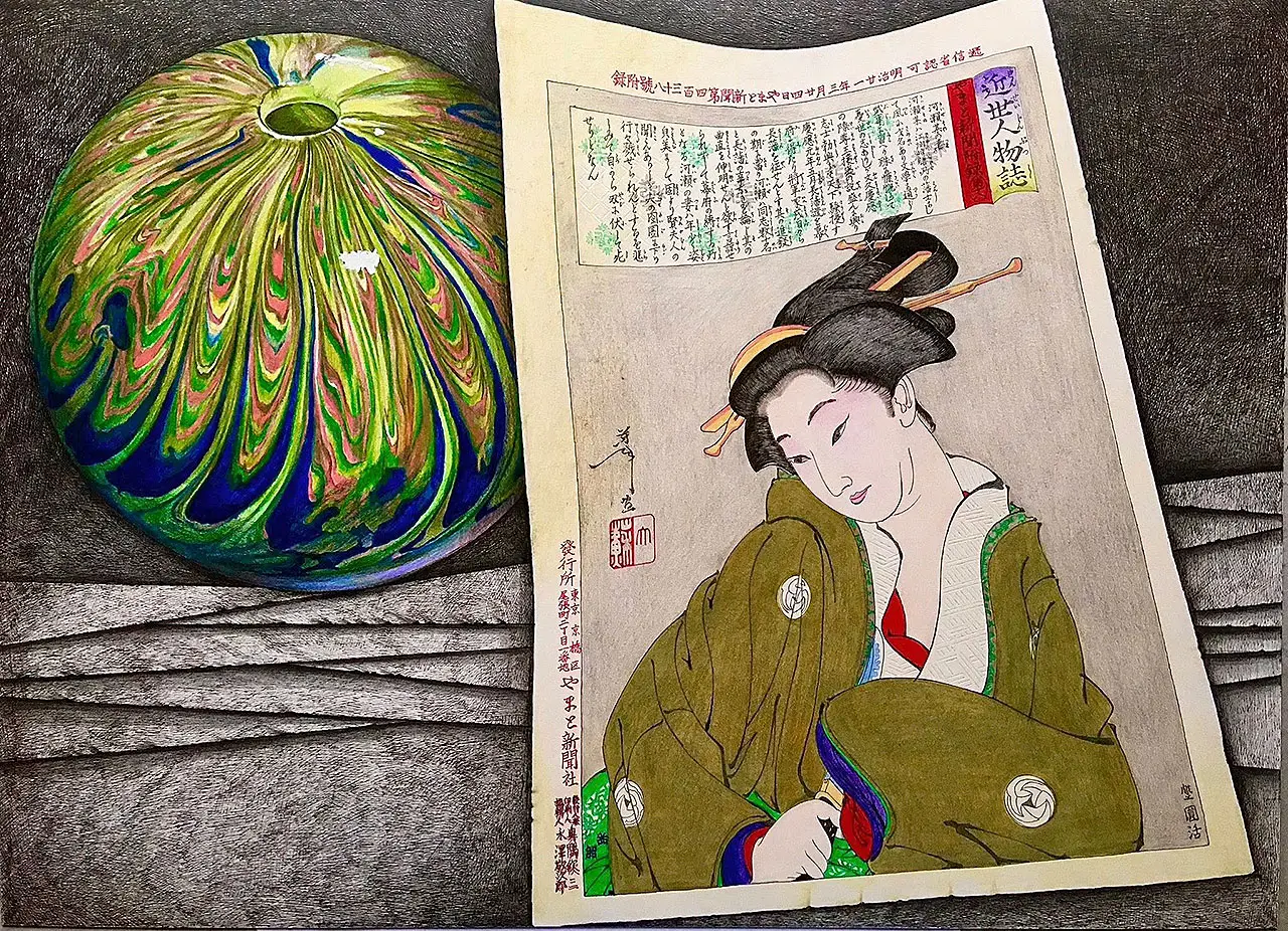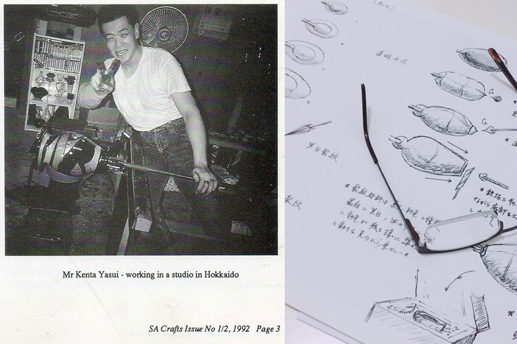 在AI數位的時代,他延續吹製玻璃的傳統培育。當遇到創作打結無法突破,他便回到浮世繪的世界,再次了解《源氏物語》和量子物理間的對話,並提筆畫下歷史、畫下自己的玻璃創意,深嘆『傳統要活著走進未來』。在畫紙上,留下玻璃藝術與浮世繪。